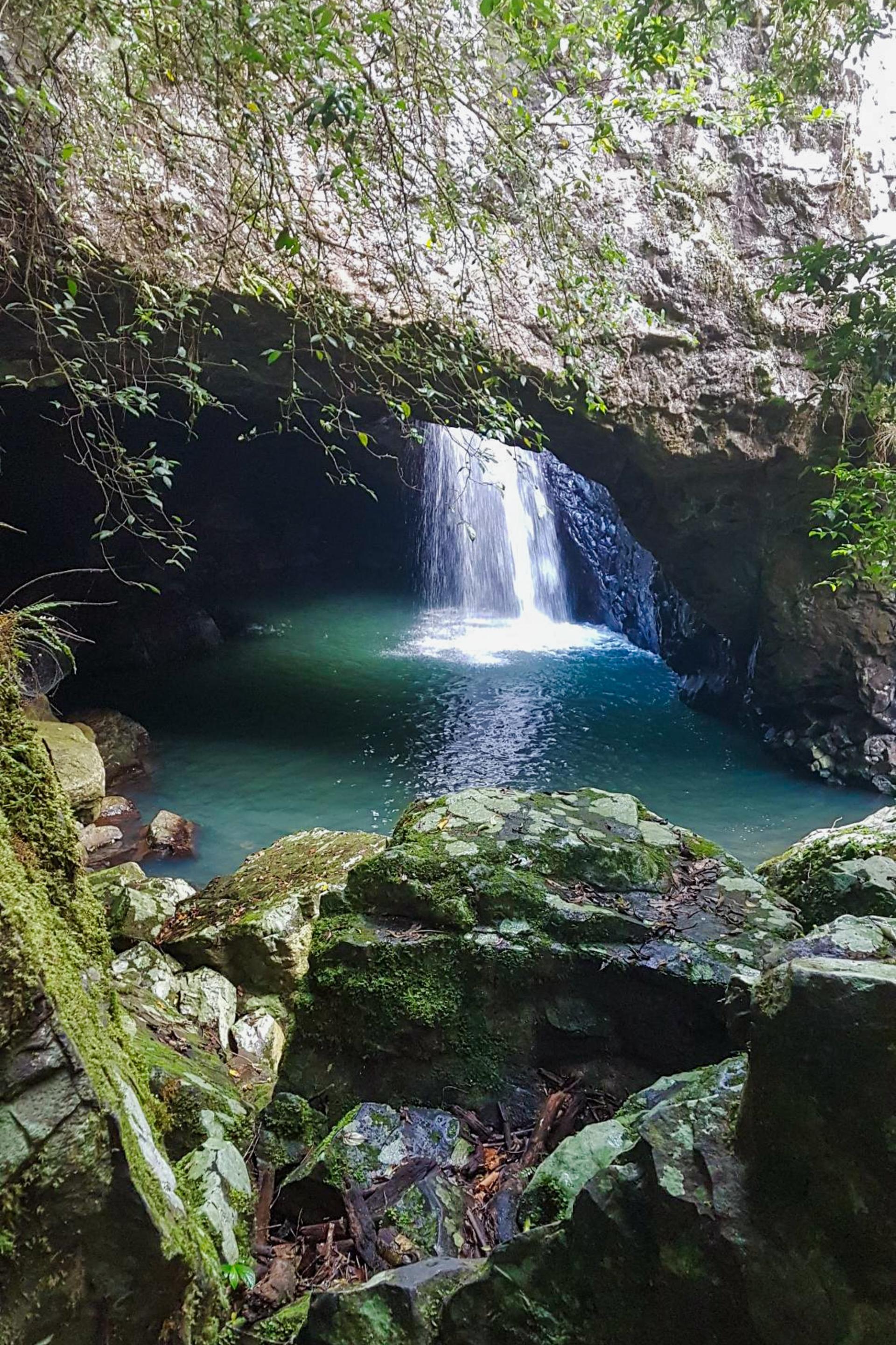 The flow of Cave Creek has eroded the roof of the ancient basalt cave over millennia to form an interior waterfall and natural pool flanked closely by the lush rainforest.