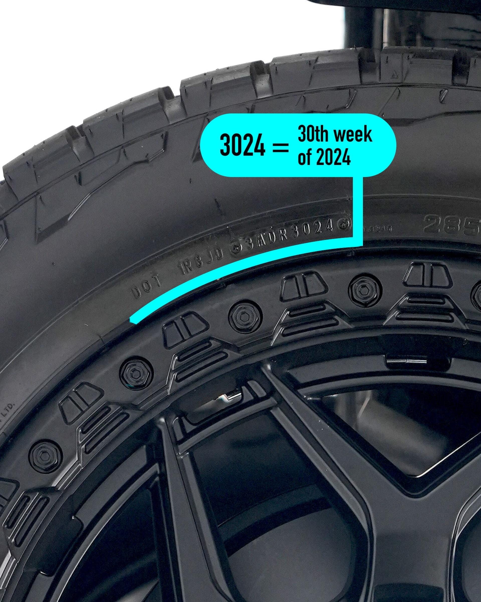 To check a tyre's age, look for the Tyre Identification Number (TIN) stamped on the sidewall. The last four digits tell you the week and year it was made. For example, 3024 means it was built in the 30th week of 2024.